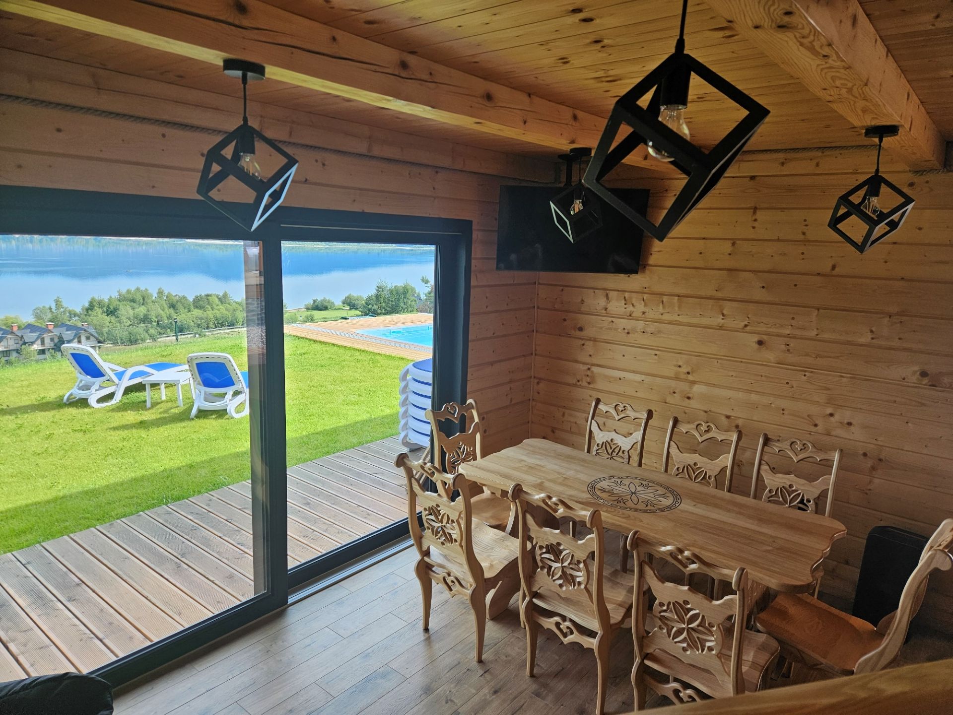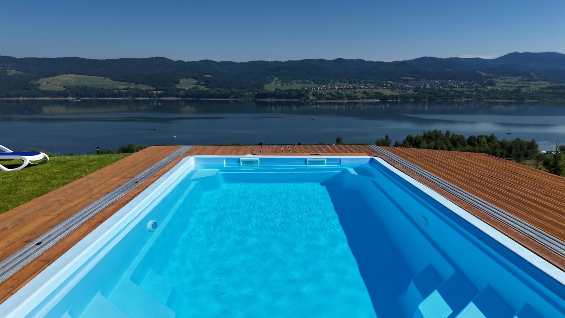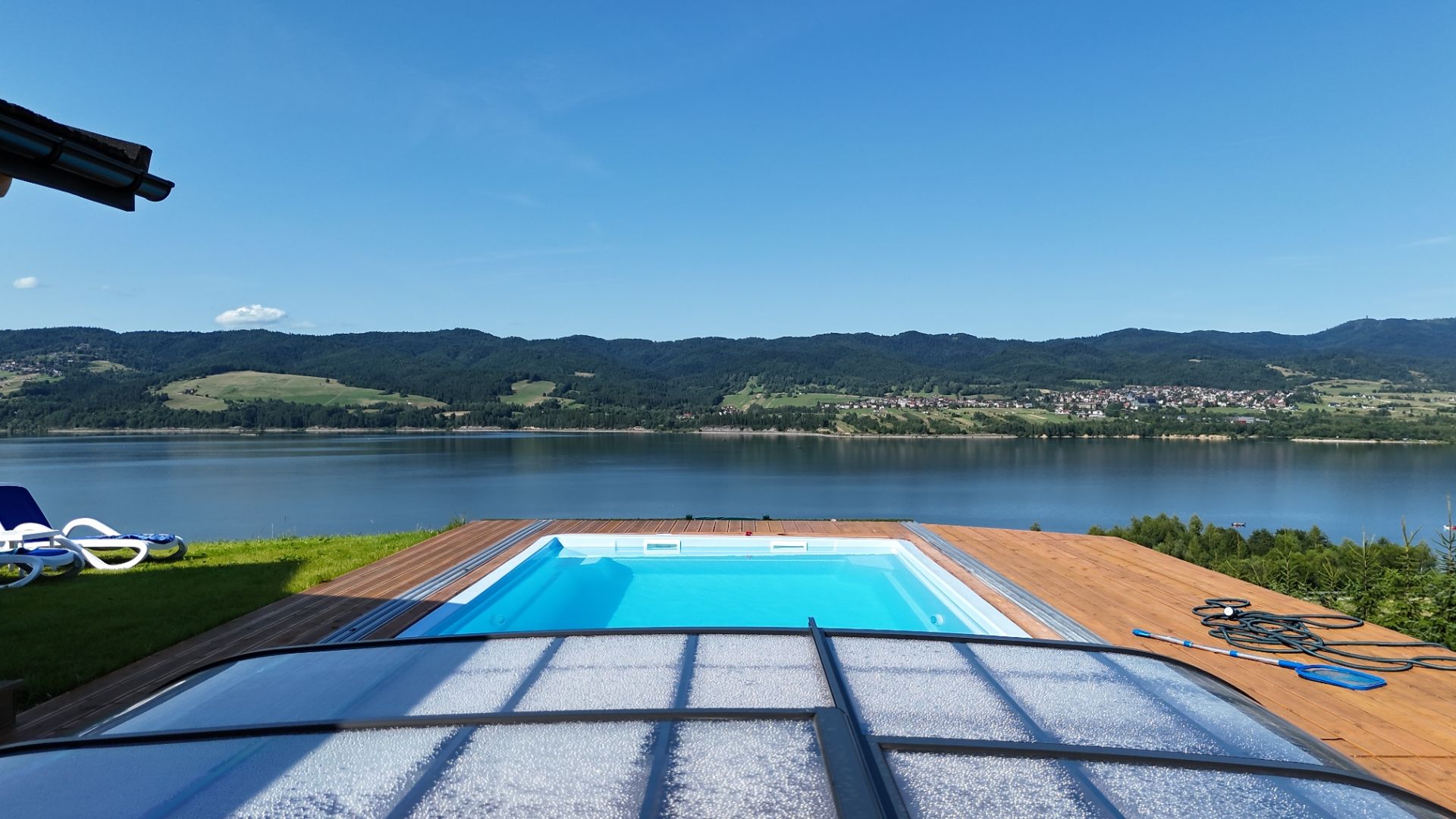 Velo Active & Spa – Nad Zalewem 32 Drewniany domek z basenem, jacuzzi, balią, sauną, boiskiem sportowym i klimatyzacją Widok na Jezioro Czorsztyńskie i góry brak sąsiadów – pełna prywatność . Tu aktywność spotyka się z relaksem